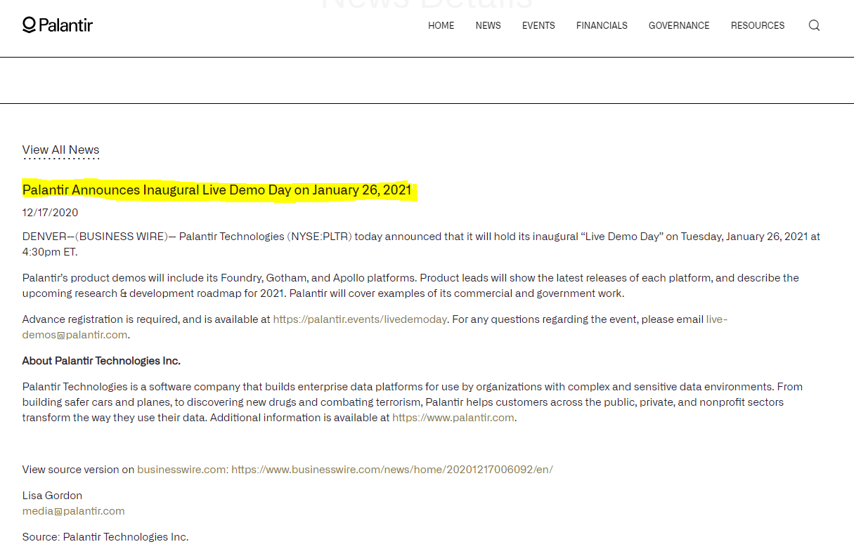 미국 빅데이터 분석 기업 '팔란티어'에서 오는 2021년 1월 26일 화요일 오후 4시 30분(동부 표준시)에 첫 라이브 '데모데이'를 개최한다고 발표했다. 팔란티어의 제품 데모에는 파운드리(Foundry), 고담(Gotham) 및 아폴로(Apollo) 플랫폼이 포함된다고 한다. 제품 리더는 각 플랫폼의 최신 릴리즈를 보여주고, 다가올 2021년 연구 개발 로드맵에 대해 설명할 예정이라고 한다. 상업 및 정부 업무의 사례를 다룰 것이라고 하니 관심있는 분들은 라이브 행사에 참여해도 좋을 듯 싶다. 데모데이는 Vimeo를 통해 라이브 스트리밍할 예정이며, https://palantir.events/livedemoday에서 사전등록할 수 있다.